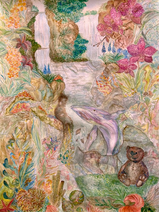 Inspired by the theme “De Nouveau”, my painting reflects the emotional journey of isolation and renewal during the pandemic. A lonely bear in a glass dome symbolizes confinement, while the blue whale represents wisdom and hope, guiding the bear towards an orchid paradise with waterfalls, signifying healing and new beginnings.